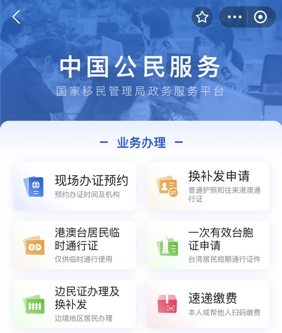 选择:出入境证件预约办理-中国公民服务-现场办证预约申请。